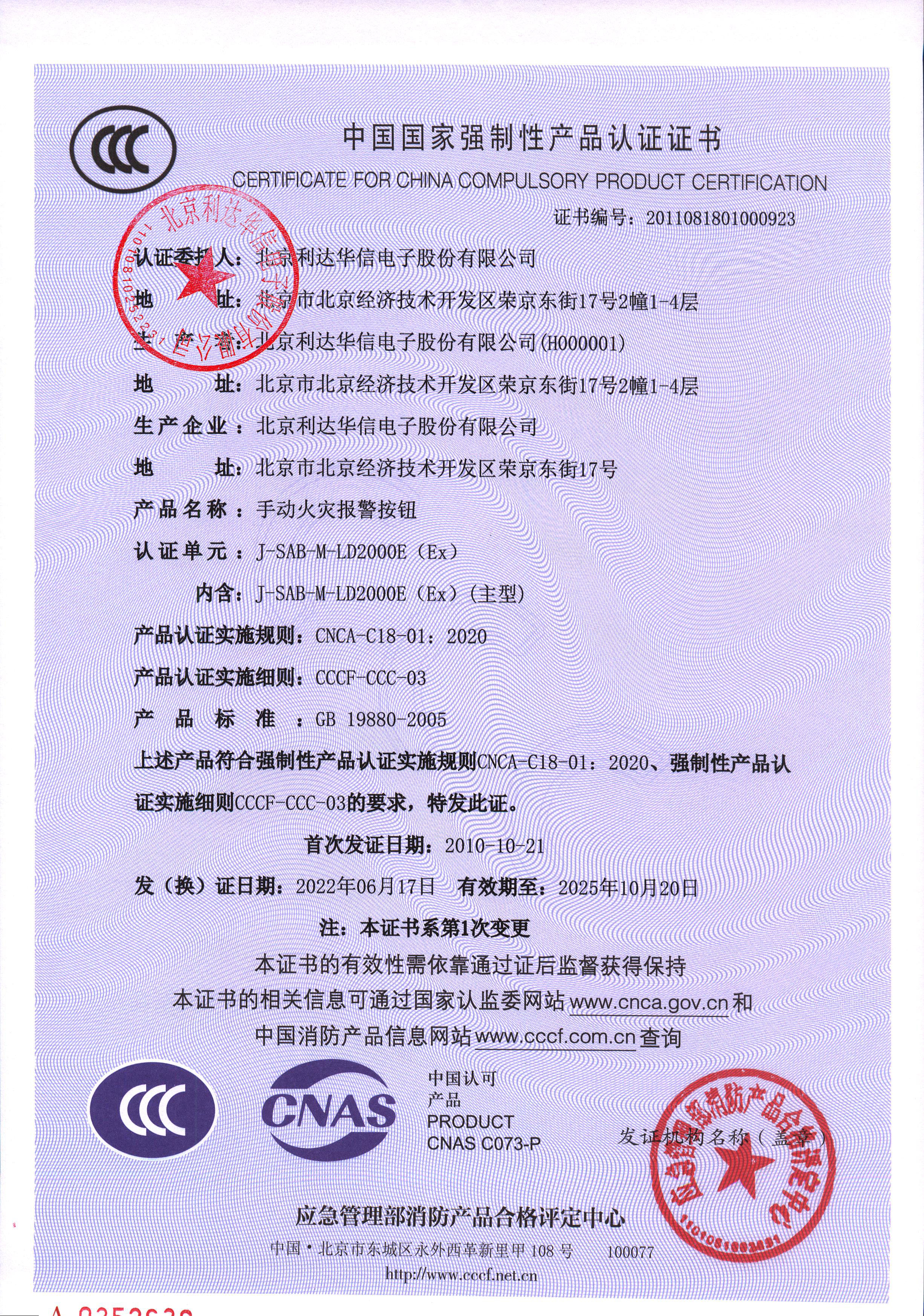 證書編號:2011081801000923 認證單元:J-SAB-M-LD2000E(Ex) 產品名稱:手動火災報警按鈕(蓋公章).jpg